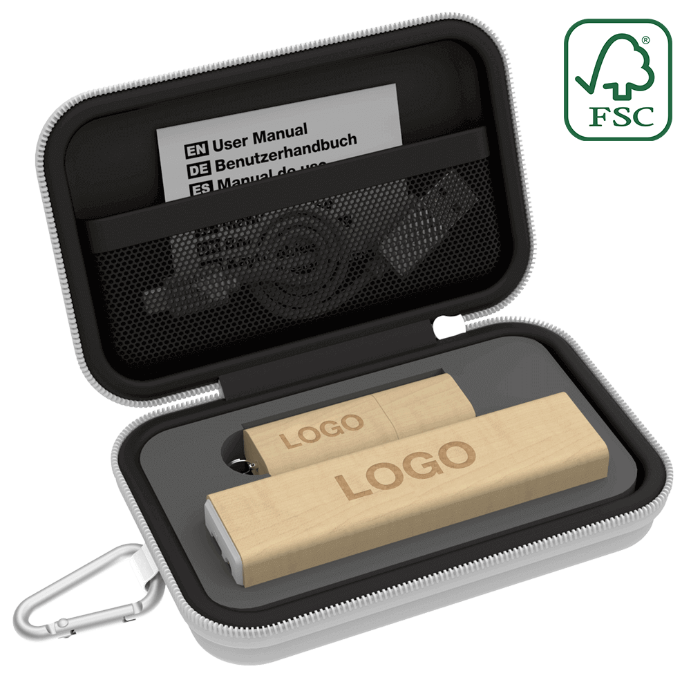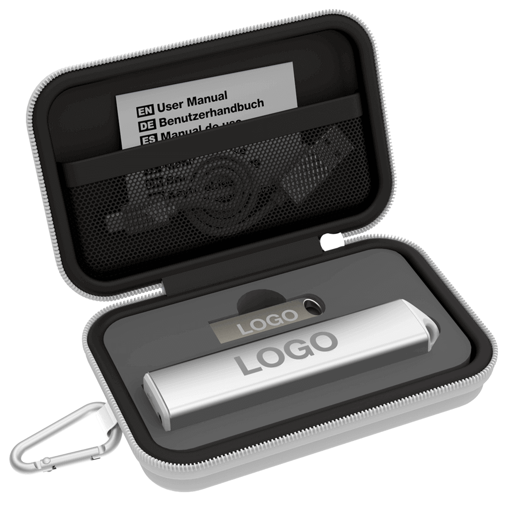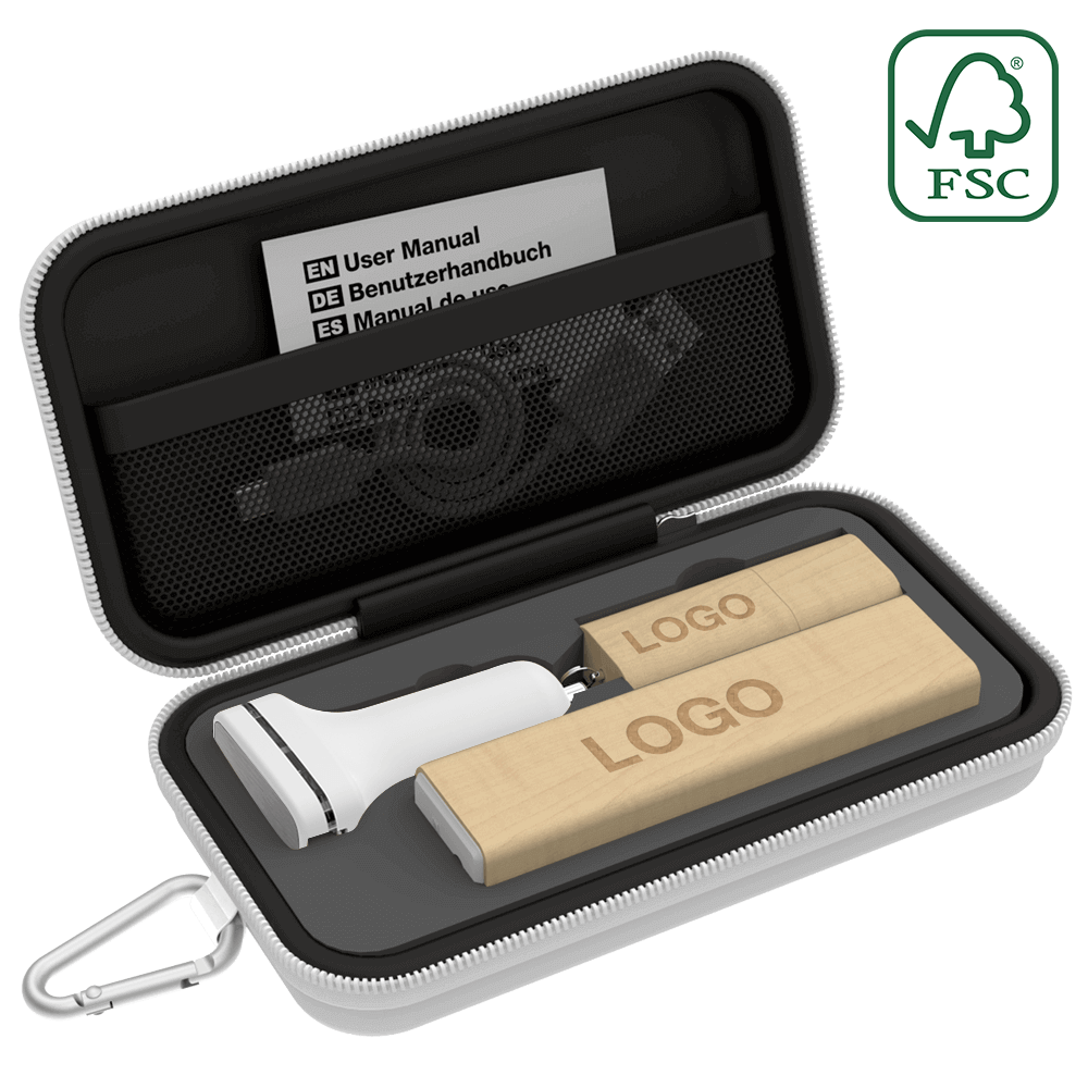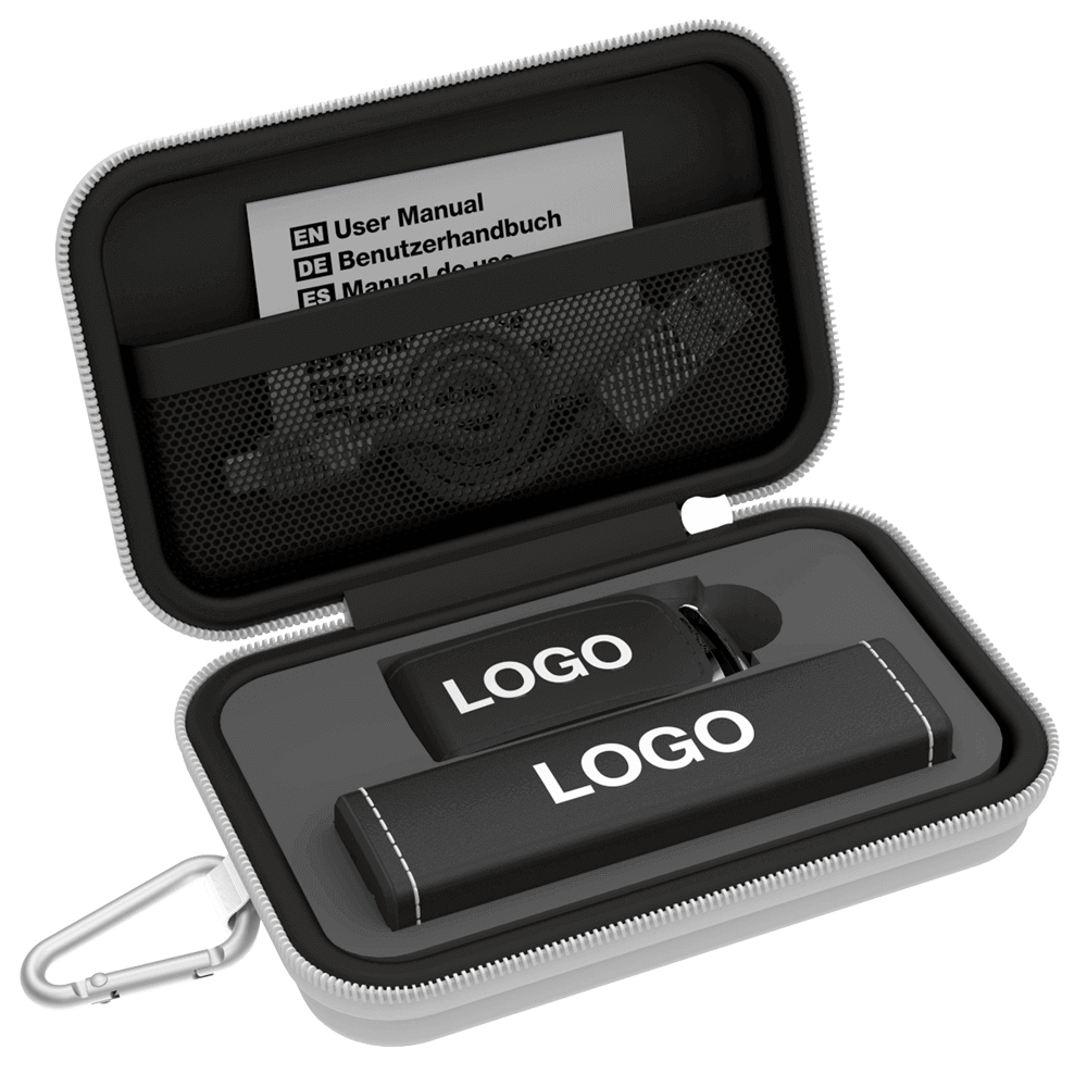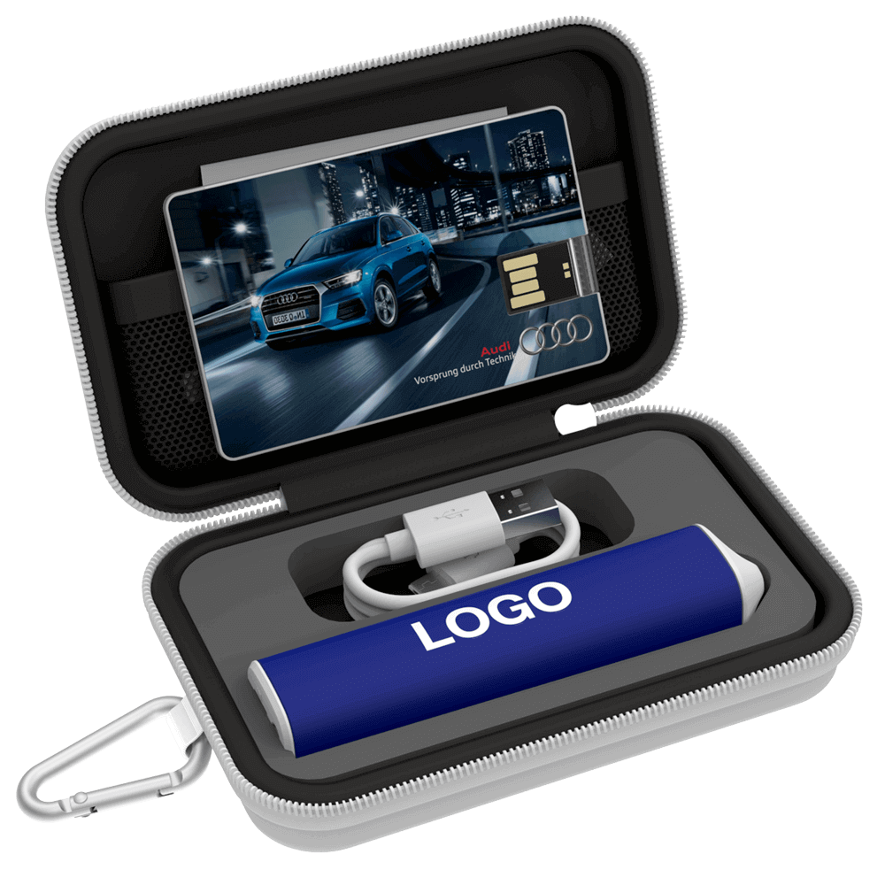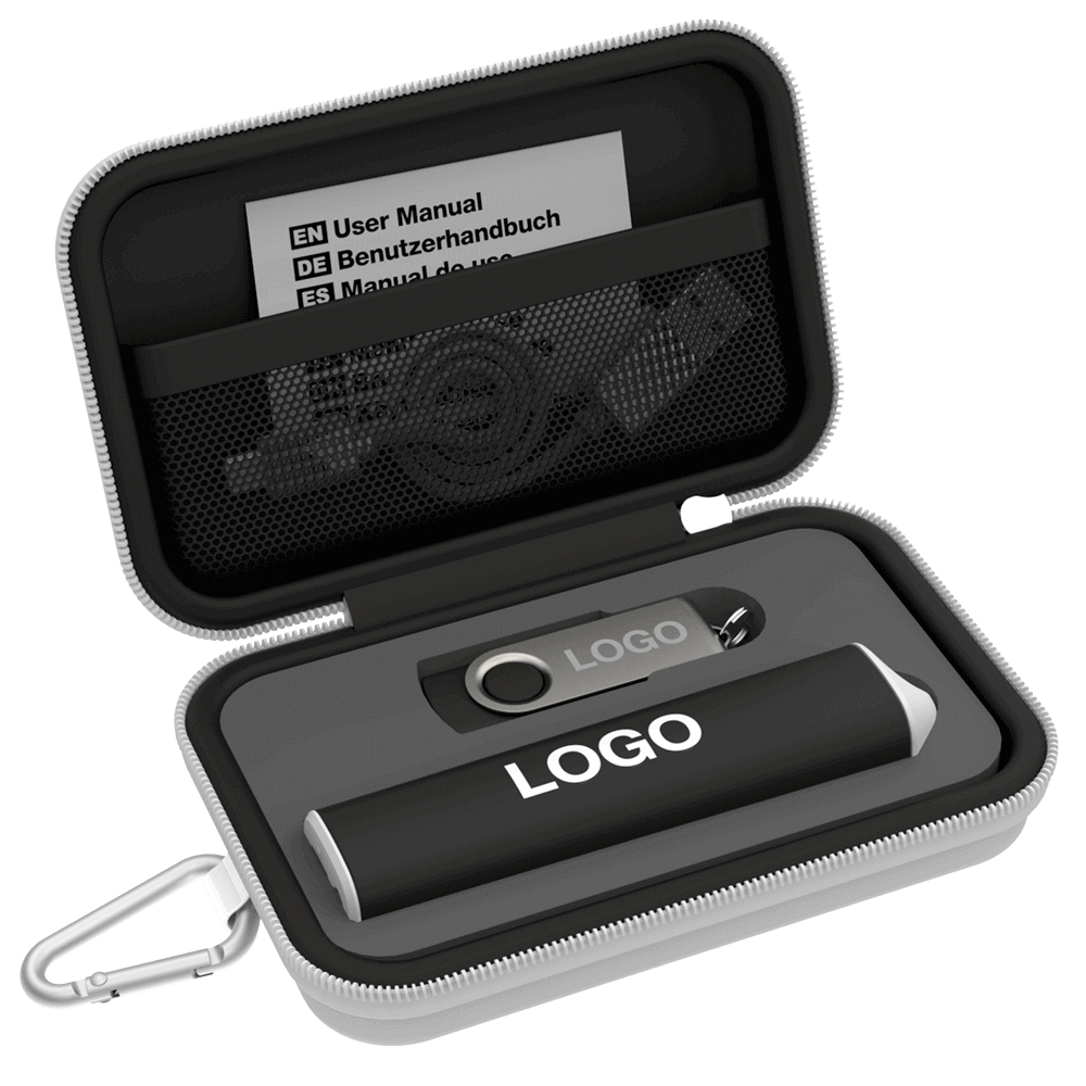Designed specifically for promotional activities, our range of beautiful Travel Gift Sets can be branded with your logo and brand message. Available in 3 sizes, our Small Gift Sets include a Flash Drive and Power Bank. Our Medium Gift Sets come with a USB Flash Drive, Power Bank and USB Car Charger. Our Large Gift Sets contain a USB Flash Drive, Power Bank, USB Car Charger and Bluetooth® Speaker. Each Gift Set also comes with a handy Carabiner.
