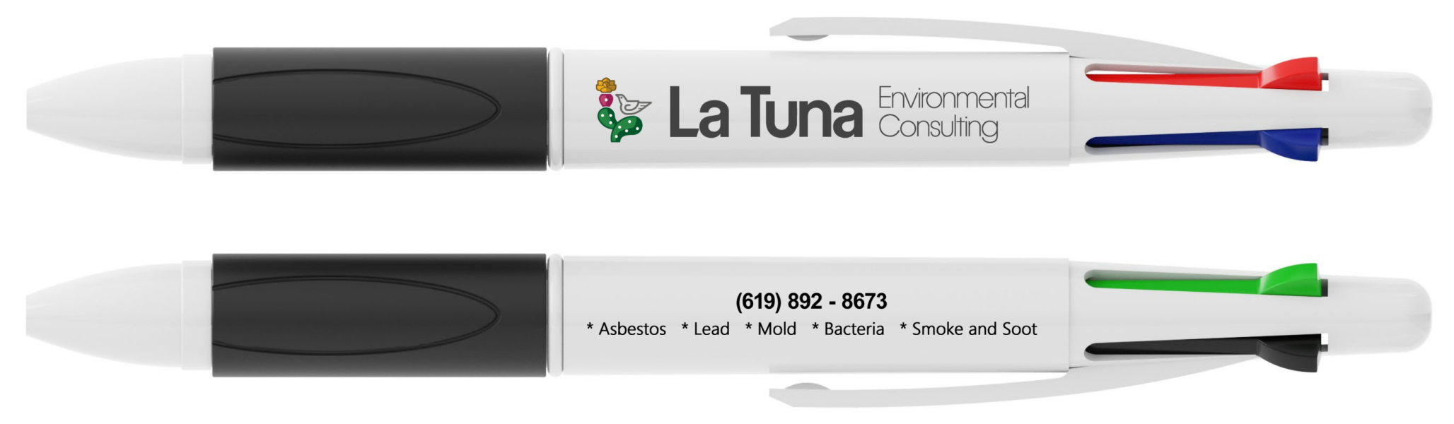 The Quad is a classic 4 colour pen that boasts blue, red, green and black ballpoints in the 1 model. Each colour option reveals and retracts via the click sliders at the top of the pen. The comfortable thermoplastic rubber grip is available in a variety of colours to complement your brand style. The exterior white shell can be Photo Printed with your logo, slogan and more.