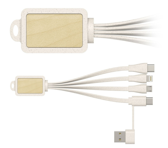 Just like our , the Multi Wood combines 4 USB cables into 1 fantastic promotional product that'll be kept and reused for years to come. Simply plug the Standard USB connector into a power source and charge up to 3 devices via the USB-C connector, Lightning adapter and the Micro-USB connector. The Multi Wood features a stunning wooden surface that's ready to be branded with your logo, and eco-friendly wheat straw bio-plastic cables.