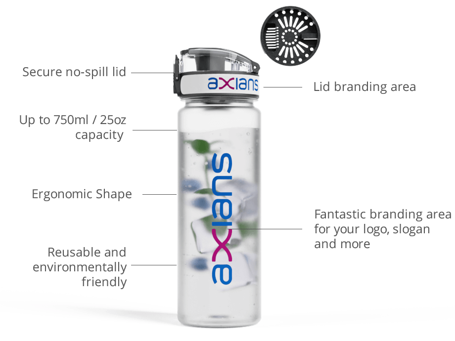 The Aqualok Infuse features a fantastic infuser lid that allows you to add and lock in your favourite fruits or vegetables to your daily drinking water. Just like our standard , the Aqualok Infuse is made from the durable translucent Tritan™ plastic and also features a secure-lock lid to prevent any unwanted spillages. There are enlarged branding areas on two sides of the bottle and also around the lid, which is a popular branding area to print with bespoke names via our Individual Naming service.